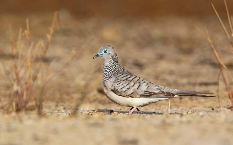“Similar in size to the Diamond Dove (Geopelia cuneata), the Peaceful Dove is identifiable by the blue skin around its eyes and top of the beak and dark barring across its neck and upper chest.”